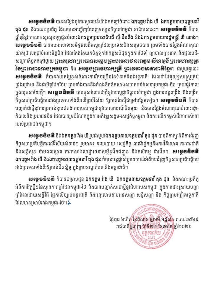 ក្នុងឱកាសនៃជំនួបពិភាក្សាការងារ, ឯកឧត្តម វ៉ាង យី (Wang Yi) និង ឯកឧត្តមនាយឧត្តមនាវី តុង ជុន (Dong Jun) បានថ្លែងអំណរគុណយ៉ាងជ្រាលជ្រៅចំពោះការទទួលស្វាគមន៍យ៉ាងកក់ក្ដៅរបស់កម្ពុជា ព្រមទាំងបានពាំនាំនូវការផ្ដាំផ្ញើសាកសួរសុខទុក្ខពីសំណាក់ ឯកឧត្តម ស៊ី ជីនពីង (Xi Jinping) ប្រធានាធិបតី និង ឯកឧត្តម លី ឈាង (Li Qiang) នាយករដ្ឋមន្ត្រីនៃសាធារណរដ្ឋប្រជាមានិតចិន ជូនចំពោះ សម្ដេចធិបតី។