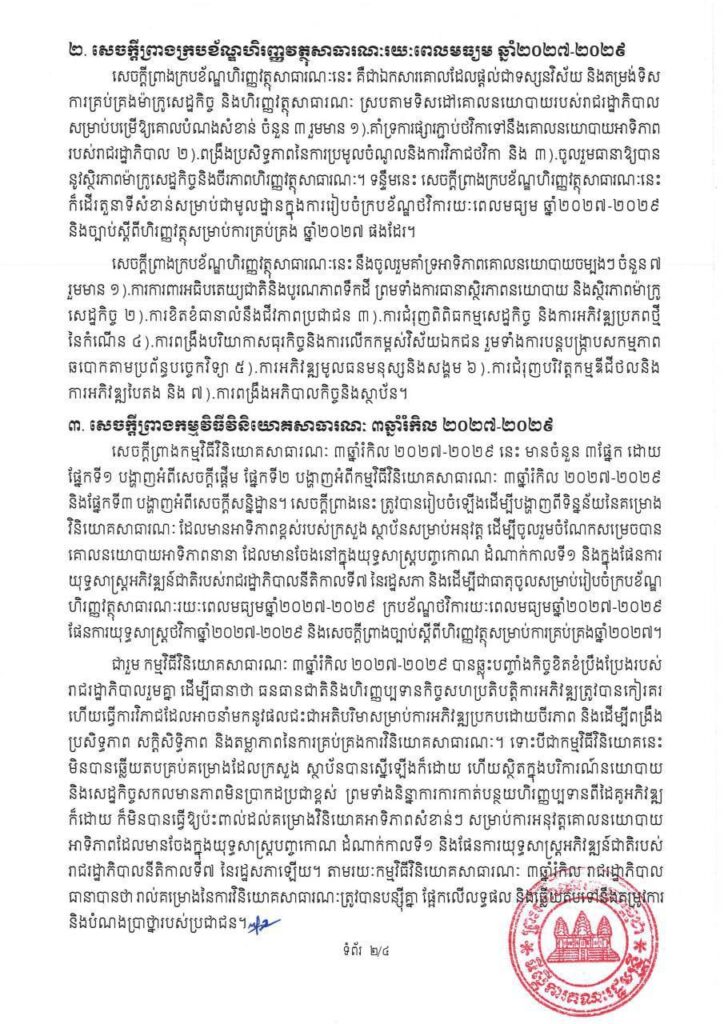 សេចក្តីព្រាងក្របខ័ណ្ឌហិរញ្ញវត្ថុសាធារណៈនេះ នឹងចូលរួមគាំទ្រអាទិភាពគោលនយោបាយចម្បងៗ ចំនួន ៧ រួមមាន ១).ការការពារអធិបតេយ្យជាតិនិងបូរណភាពទឹកដី ព្រមទាំងការធានាស្ថិរភាពនយោបាយ និងស្ថិរភាពម៉ាក្រូសេដ្ឋកិច្ច ២).ការខិតខំធានាលំនឹងជីវភាពប្រជាជន ៣).ការជំរុញពិពិធកម្មសេដ្ឋកិច្ច និងការអភិវឌ្ឍប្រភពថ្មីនៃកំណើន ៤).ការពង្រឹងបរិយាកាសធុរកិច្ចនិងការលើកកម្ពស់វិស័យឯកជន រួមទាំងការបន្តបង្ក្រាបសកម្មភាពឆបោកតាមប្រព័ន្ធបច្ចេកវិទ្យា ៥).ការអភិវឌ្ឍមូលធនមនុស្សនិងសង្គម ៦).ការជំរុញបរិវត្តកម្មឌីជីថលនិងការអភិវឌ្ឍបៃតង និង ៧).ការពង្រឹងអភិបាលកិច្ចនិងស្ថាប័ន។