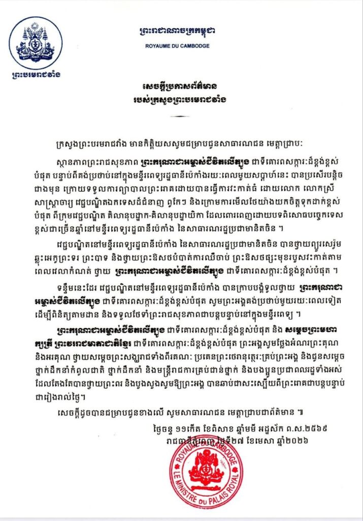 ភ្នំពេញ ៖ ក្រសួងព្រះបរមរាជវាំង នៅថ្ងៃទី២៧ ខែមេសា ឆ្នាំ២០២៦ បានចេញសេចក្តីប្រកាសព័ត៌មានអំពីស្ថានភាពព្រះរាជសុខភាពរបស់ព្រះករុណា ជាអម្ចាស់ជីវិតលើត្បូងក្រោយទទួលការព្យាបាលព្រះរោគដោយបានធ្វើការវះកាត់។
