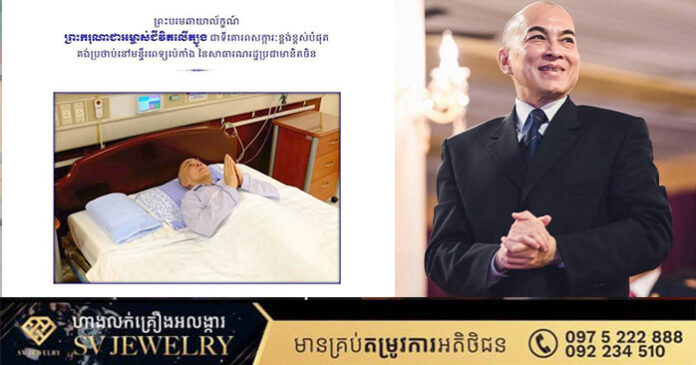 ក្រសួងព្រះបរមរាជវាំង មានកិត្តិយសសូមជម្រាបជូនសាធារណជន មេត្តាជ្រាបៈ ស្ថានភាពព្រះរាជសុខភាព ព្រះករុណាជាអម្ចាស់ជីវិតលើត្បូង ជាទីគោរពសក្ការៈដ៏ខ្ពង់ខ្ពស់ បំផុត បន្ទាប់ពីគង់ប្រថាប់នៅក្នុងមន្ទីរពេទ្យរដ្ឋធានីប៉េកាំងរយៈពេលមួយសប្តាហ៍នេះ បានប្រសើរបន្តិច ជាងមុន ក្រោយទទួលការព្យាបាលព្រះរោគដោយបានធ្វើការវះកាត់ធំ ដោយលោក លោកស្រី សាស្ត្រាចារ្យ វេជ្ជបណ្ឌិតឯកទេសដ៏ជំនាញ ពូកែៗ និងក្រោមការមើលថែយ៉ាងយកចិត្តទុកដាក់ខ្ពស់ បំផុត ពីក្រុមវេជ្ជបណ្ឌិត គិលានុបដ្ឋាក-គិលានុបដ្ឋាយិកា ដែលពោរពេញដោយបទពិសោធបច្ចេកទេស ខ្ពស់ជាច្រើនឆ្នាំនៅមន្ទីរពេទ្យរដ្ឋធានីប៉េកាំង នៃសាធារណរដ្ឋប្រជាមានិតចិន ។